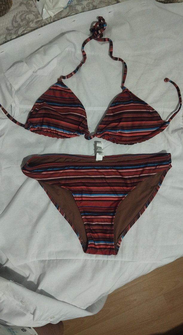 Kahverengi tie-dye desenli, bağlamalı askılı, bohem tarzda ve vücuda oturan bikini, plajda zahmetsiz şıklık sunar.