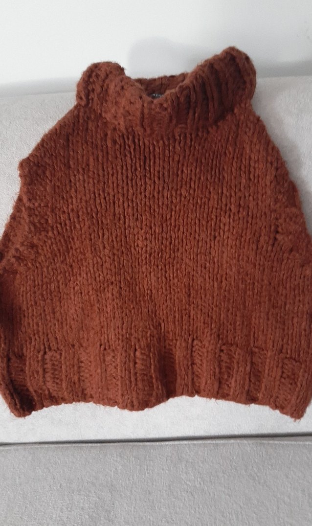 Kahverengi, boğazlı, bol kesim kısa triko suveter. Bohem tarzında sade ve rahat, günlük kullanı için uygundur.