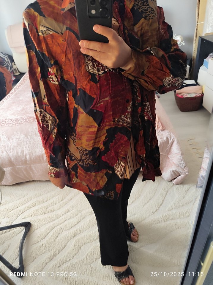 Bohem tarzda, kahverengi desenli, uzun kollu, yüksek yakalı ve dökümlü tasarıma sahip ipeksi kumaştan gömlek. Midi boy ve rahat kesim, günlük kullanım için uygundur. ✨
