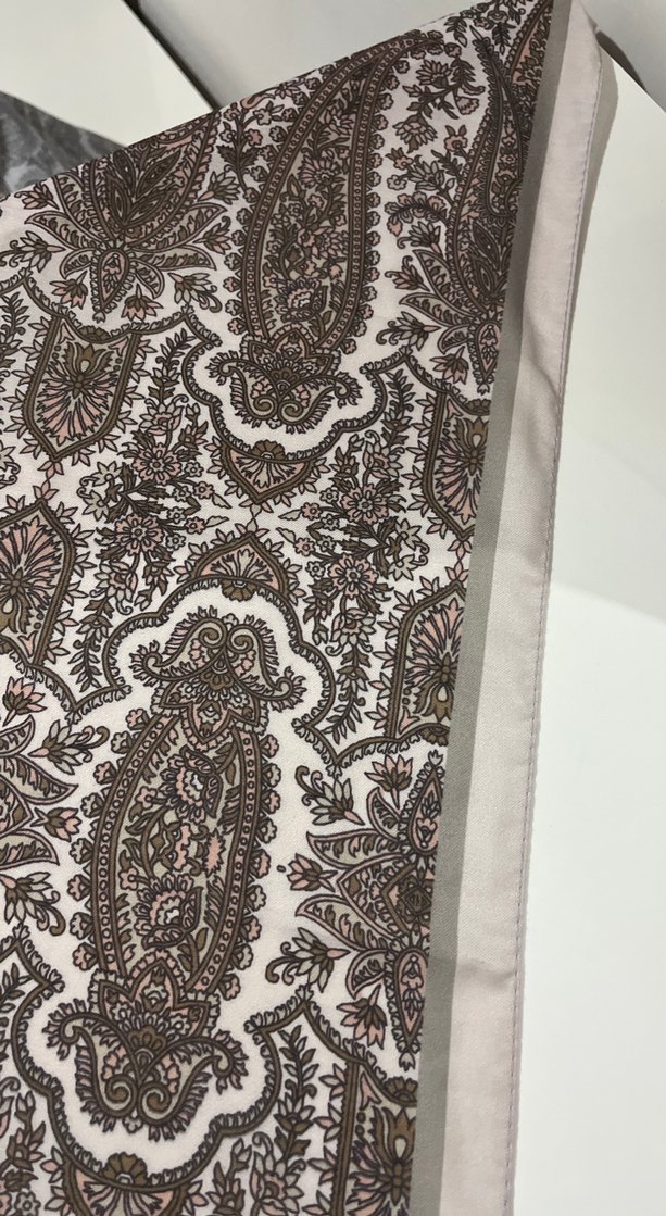 Kahverengi ve gri tonlarda, detaylı bohem desenli, yumuşak sentetik kumaştan kadın şal. Drapeli tasarımıyla retro ve hippie tarzına uygun.