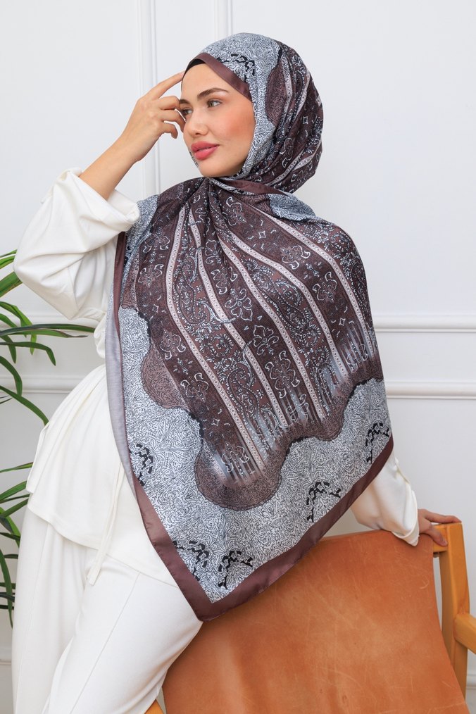 Bohem tarzda, kahverengi ve gri tonlarda, ipek dokulu, drapeli kadın şalıdır.