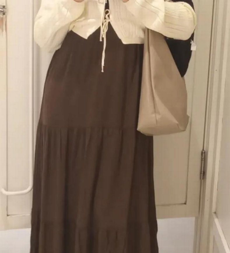 Kahverengi, bol kesim ve drapeli uzun etek. Yumuşak sentetik kumaştan, günlük kullanım için uygun sade ve bohem tarzda. tekliflerinize acigim