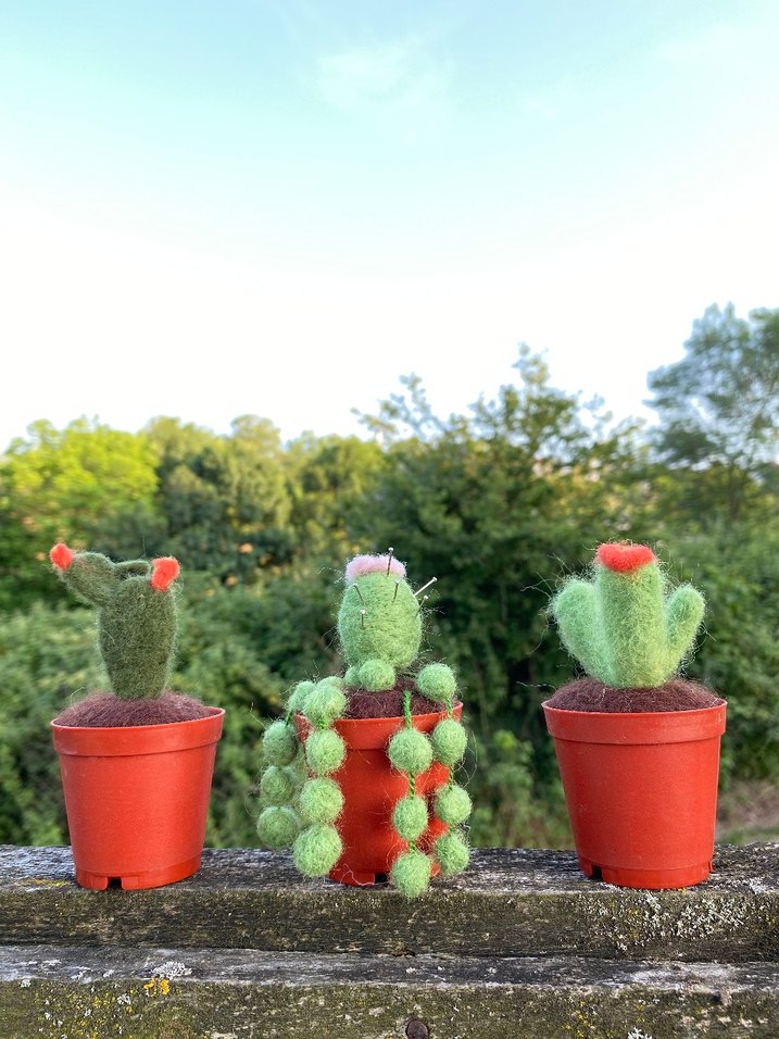 Üçlü keçe kaktüs seti, küçük terracotta saksılarda, farklı şekillerde ve renkli detaylarla bohem tarz ev dekorasyonu için ideal. Ürün boyutu 10 cm