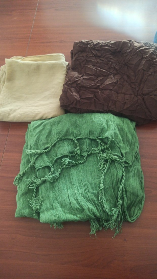 Keten kumaştan yapılmış, kahverengi, yeşil ve bej renklerde bohem tarzda kadın şalları. Biri püsküllü ve drapeli, rahat bir görünüm sunar. kahve rengide ufak bir sokuk vardı ama kullanmaya engel değil gözükmüyor Bej rengini de ben yanlarını diktim