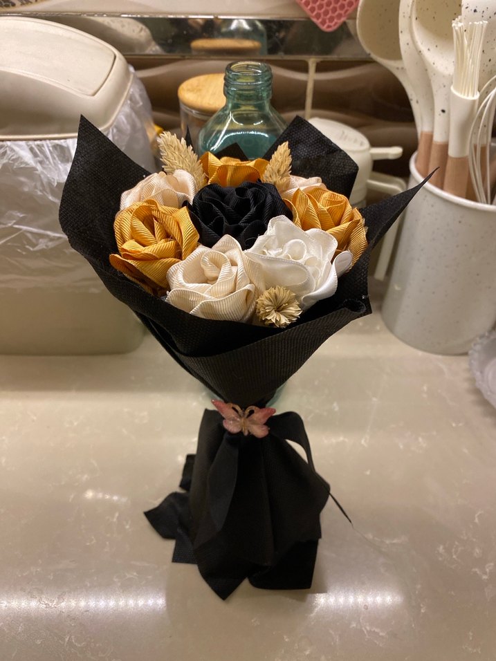 Hardal sarısı, krem ve siyah kumaş çiçeklerden oluşan bohem tarzda, siyah kağıda sarılı buket. Küçük kelebek süsü bulunur.