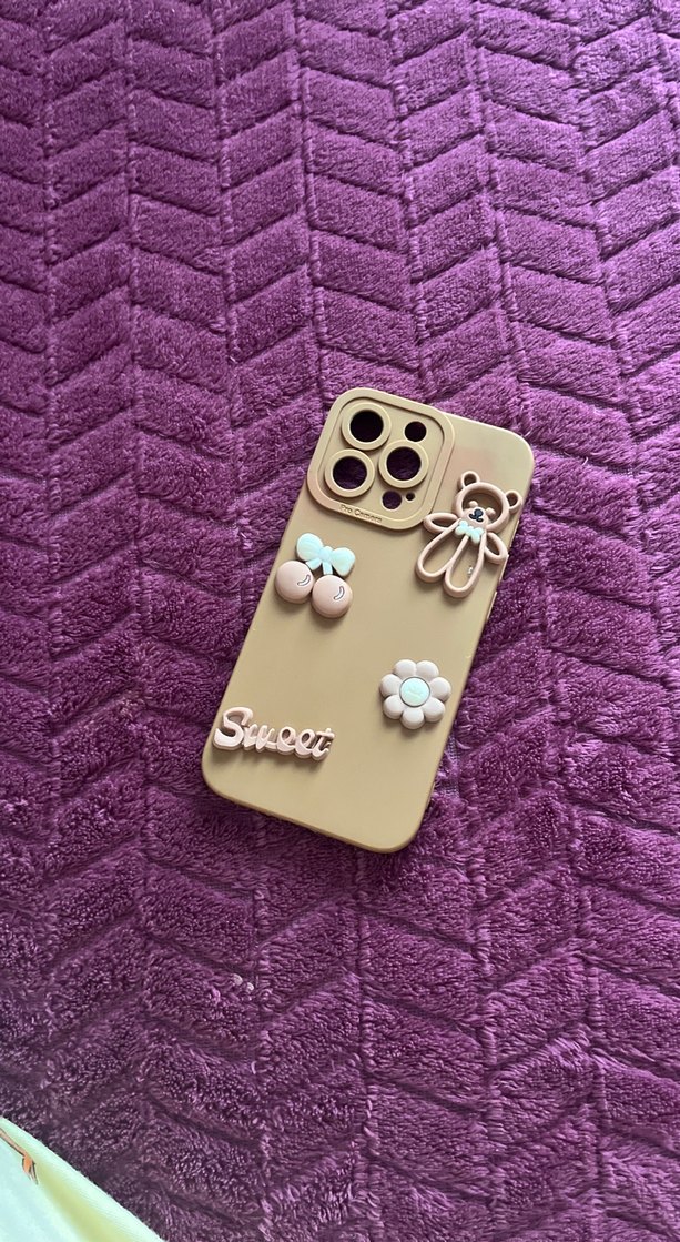 Bohem tarzda, mor pastel renkli, kürk detaylı ve ayıcık, kiraz, çiçek ile "Sweet" yazılı süslemeler bulunan telefon kılıfı.
