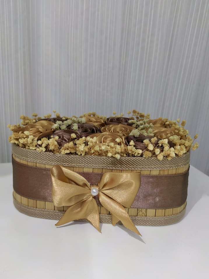 Üstü kurutulmuş çiçeklerle süslü, önünde inci detaylı altın renkli fiyonk bulunan bohem tarzda dekoratif kutu.