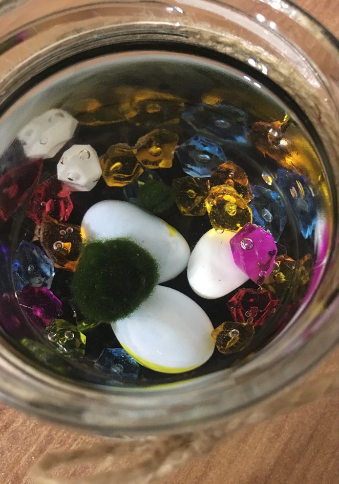 Altın kapaklı, rustik ip bağlamalı, içinde renkli taşlar ve boncuklar bulunan dekoratif cam kavanoz. Bohem tarz dekor için uygun.