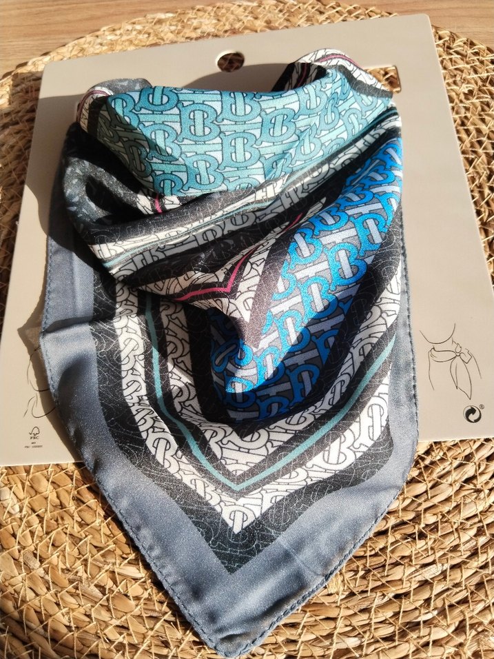 Bohem tarzda, mavi ve gri tonlarında, yumuşak kumaştan yapılmış, drapeli kadın fular.