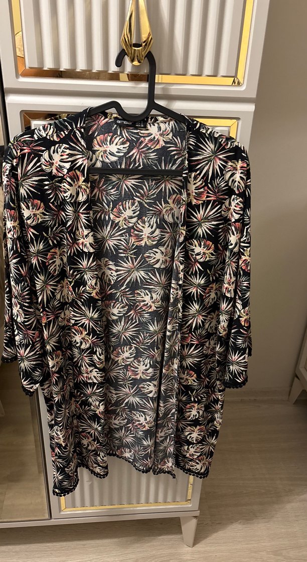 Bohem tarzda, düğmeli, V yakalı, uzun kollu, çok renkli desenli, midi uzunlukta, bol kesim kadın kimono. 36-40 beden uyumlu