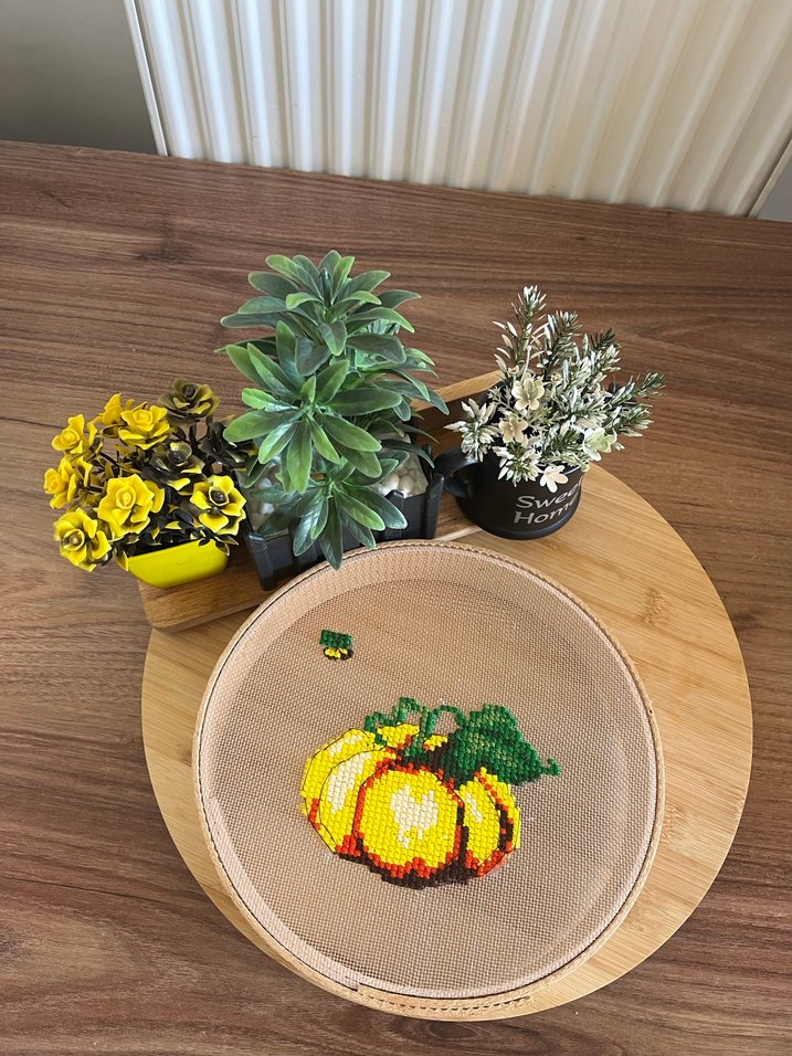 Doğal kumaş üzerine nakış tekniğiyle işlenmiş canlı kabak motifi, bohem tarzda ahşap kasnakta sergileniyor.