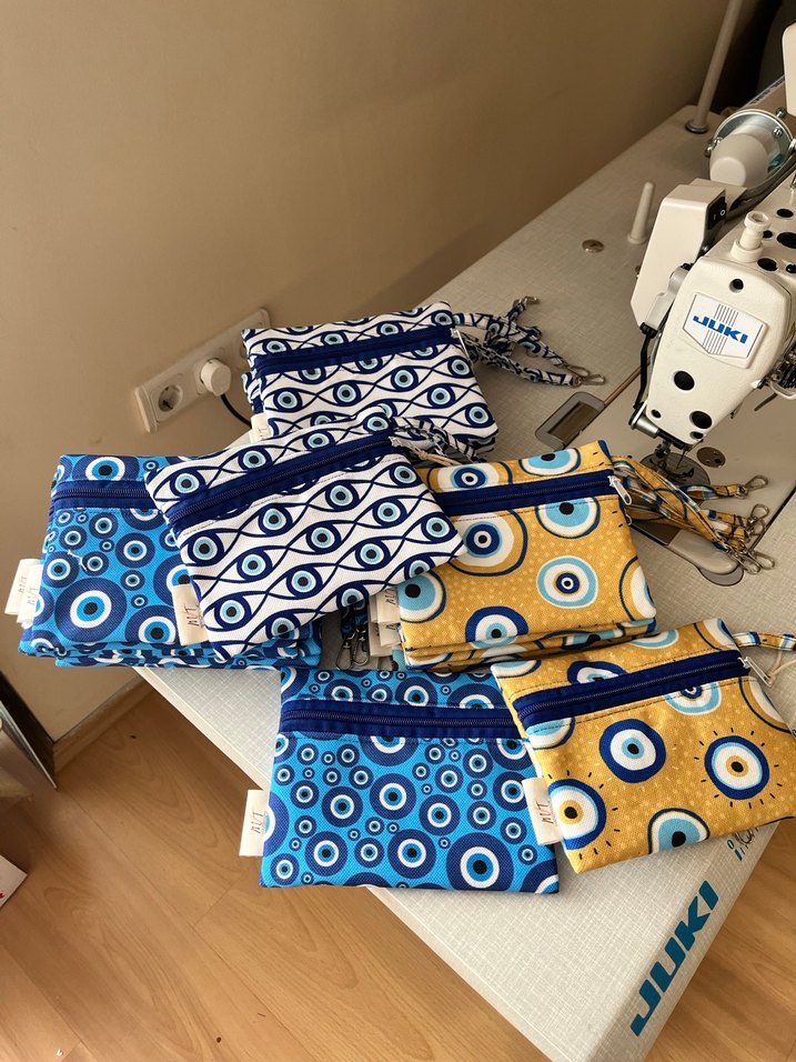 Mavi, beyaz ve sarı renklerde nazarlık ve daire desenli, bohem tarzda el yapımı kumaş cüzdanlar. Fermuarlı ve yumuşak dokulu.