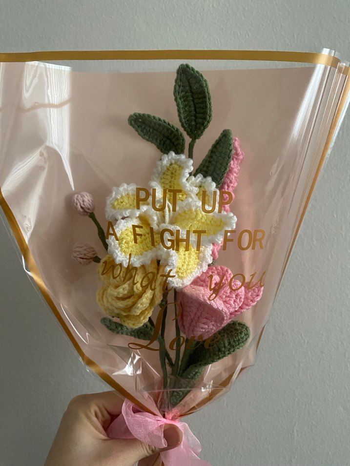 Sarı ve pembe çiçeklerin yeşil yapraklarla örüldüğü bohem tarzda örgü buket. Şeffaf altın kenarlı folyoya sarılı, pembe kurdeleli.