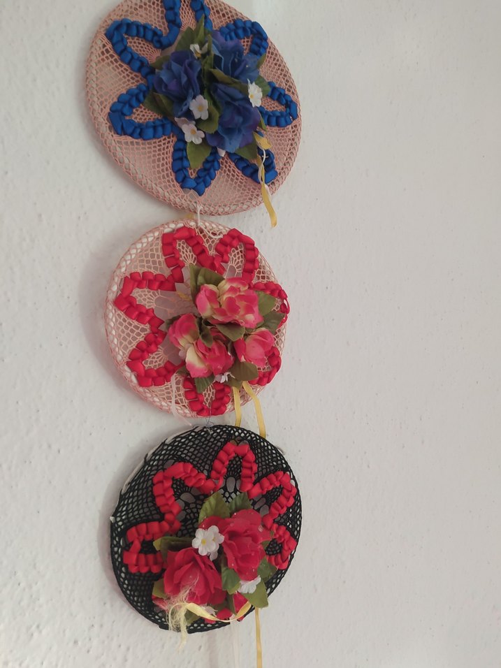 Bohem tarzda, farklı renklerde üç yuvarlak örgü parça ve canlı yapay çiçeklerle süslenmiş duvar dekoru.
