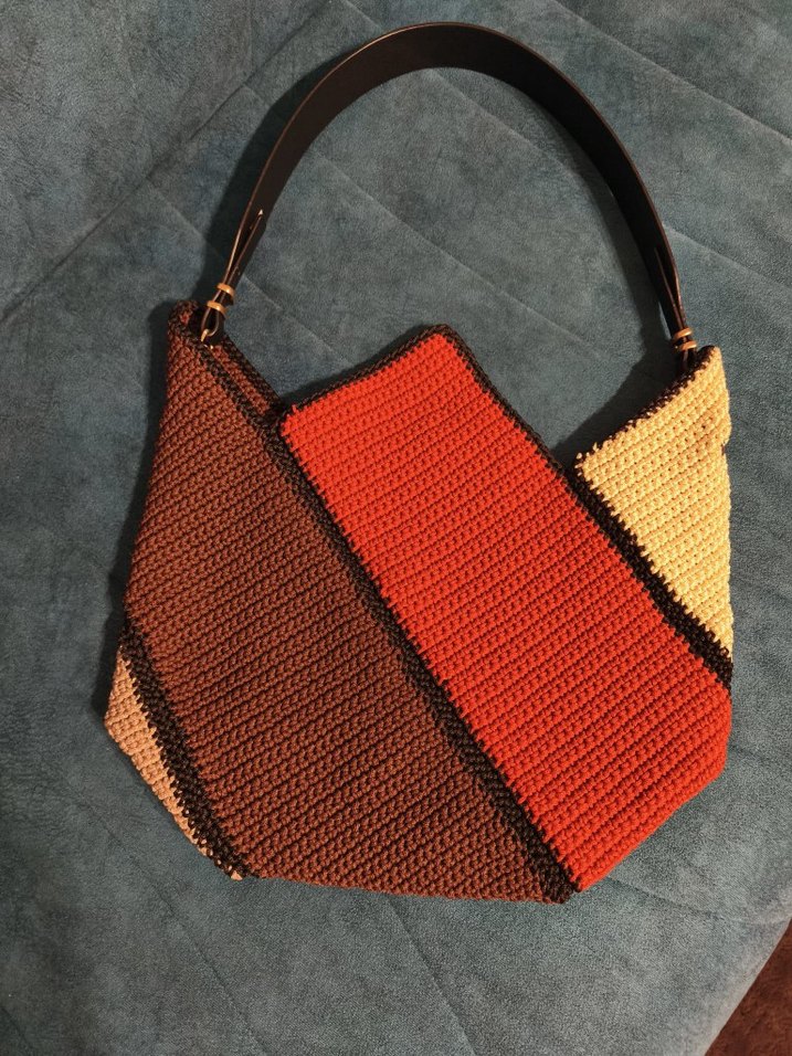 Koyu kahverengi, turuncu ve krem tonlarda örgü detaylı, deri saplı bohem tarzda kadın çantası. Günlük kullanıma uygun, rahat ve şık görünümlü.
