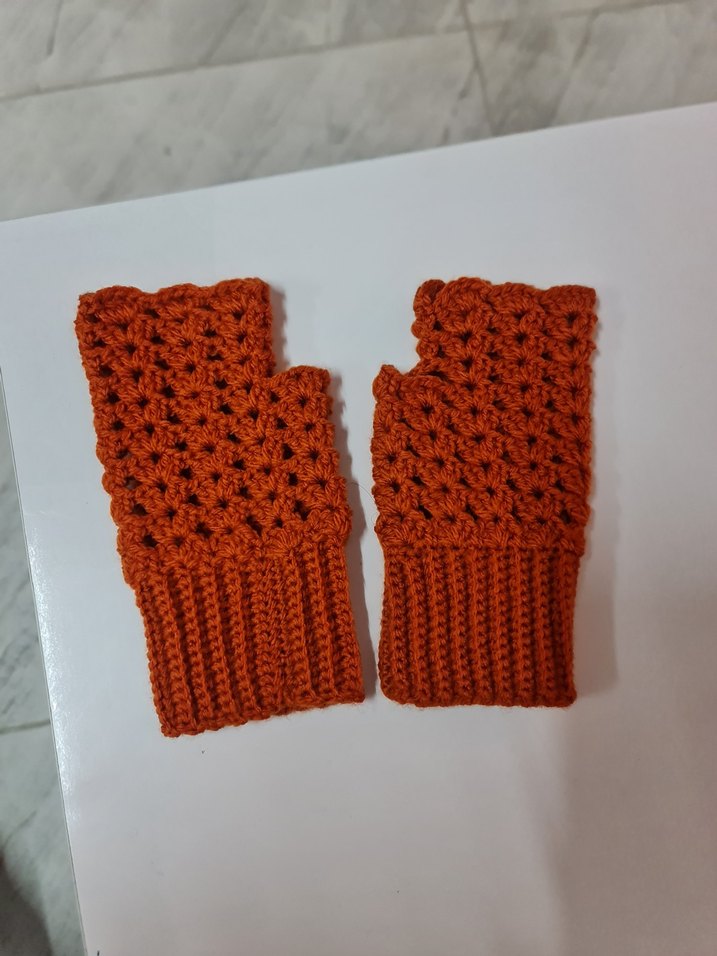 Renkli kahverengi örgü, bohem tarzda, açık parmaklı kadın eldiveni, nostaljik bir görünüm sunar.