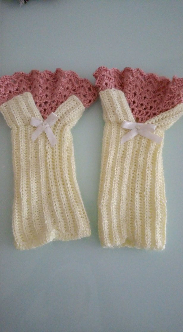 Kadın eldivenleri, pastel beyaz gövde ve yumuşak pembe dantel uçlarla örülmüştür. Küçük kurdele detayları ve bohem tarzı ile sıcak bir görünüm sunar.