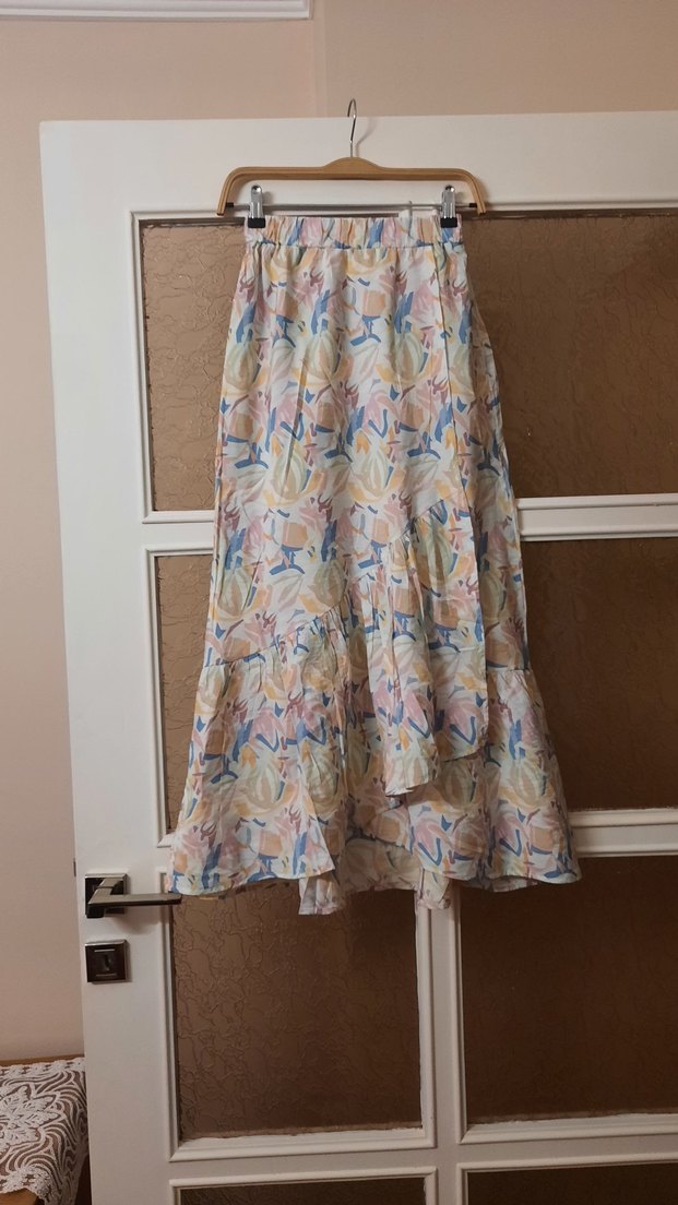 Bohem tarzda, bol kesim ve drapeli uzun etek. Pastel tonlarda batik desenli, yumuşak sentetik kumaştan, günlük kullanım için uygun.Beli 30 cm. lastikli. Boyu 90 cm. Önü detaylı etek.