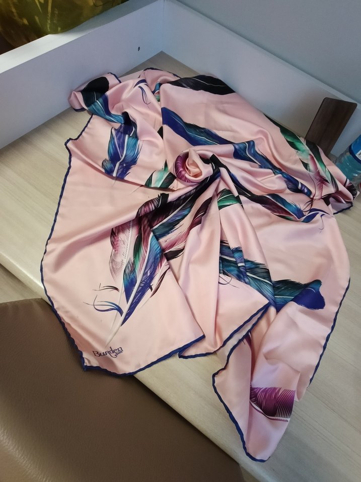 İpek dokulu, pastel pembe renkte, canlı tüy desenli, bohem tarzda kadın şalı.