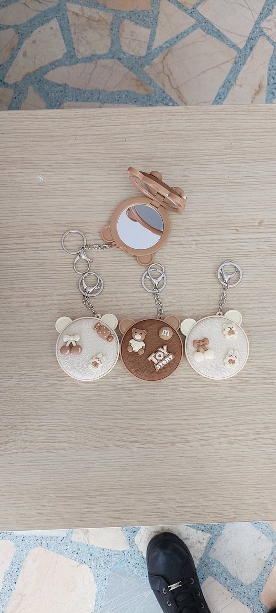 Bej tonlarında, püsküllü ve oyuncu ayıcık detaylı renkli bohem tarzda anahtarlık. Yuvarlak kutunun içinde küçük bir ayna bulunur. ayna