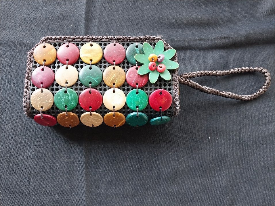 Bohem tarzda, renkli yuvarlak diskler ve çiçek detaylarıyla el yapımı çanta cüzdan, ölçüleri 14x7 cm.