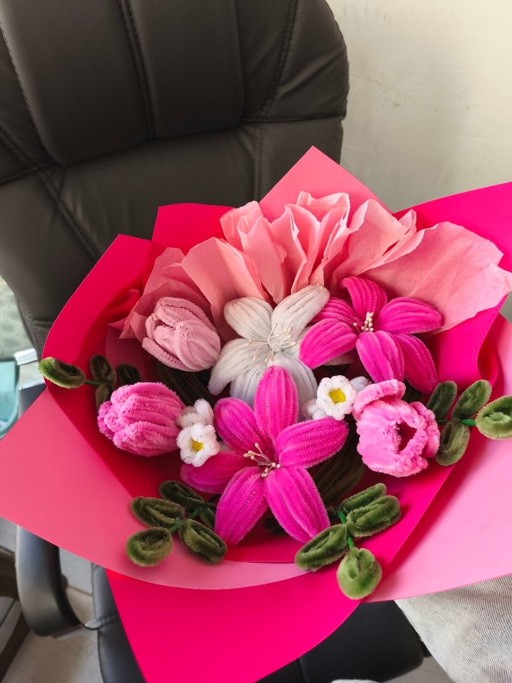 Bohem tarzda, pembe ve beyaz tonlarında kadife çiçekler ve yeşil yapraklar içerir. Canlı pembe kağıtla sarılmış, renkli ve sanatsal bir buket.