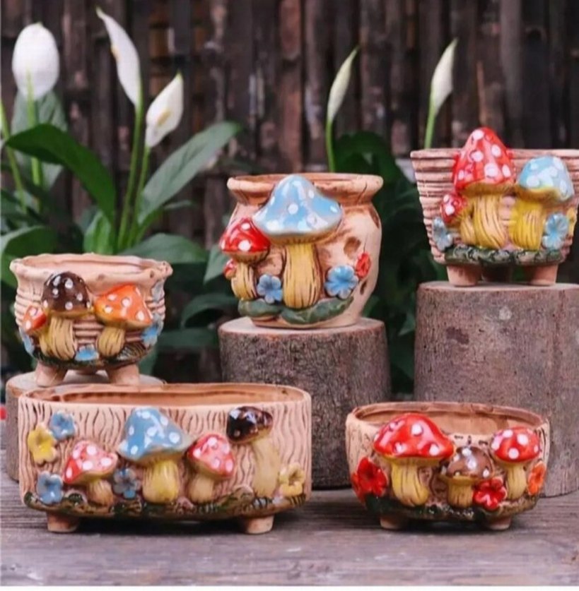 Bohem tarzda, renkli mantar figürlü seramik saksılar, mekânınıza doğal bir hava katmak için uygun .