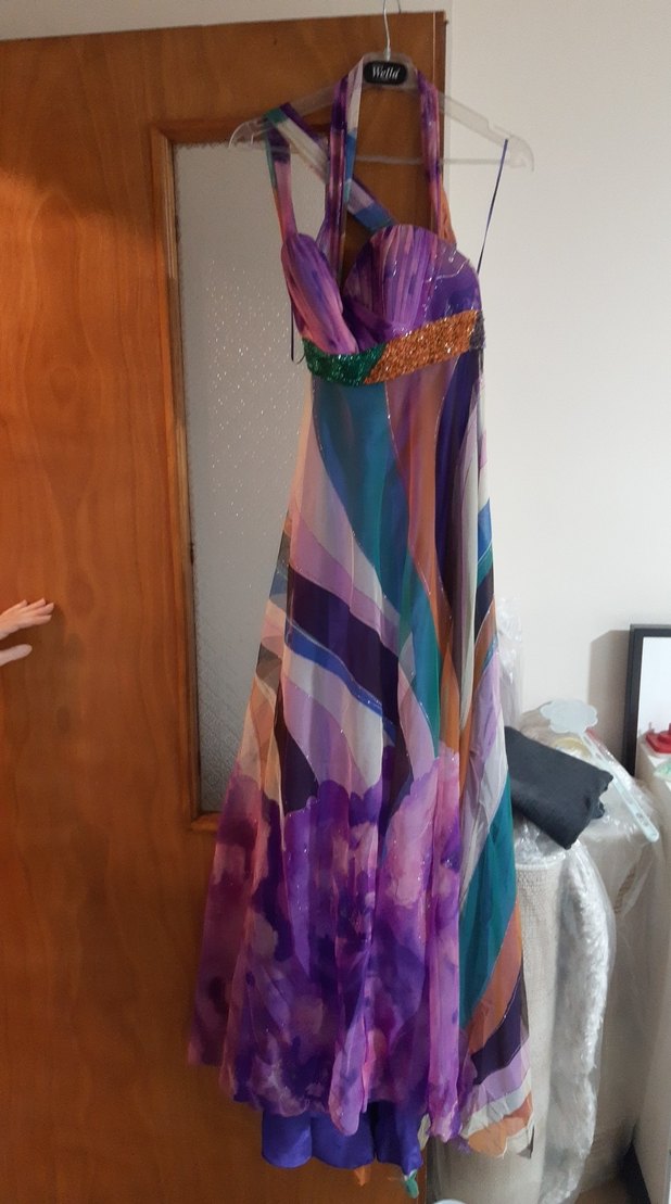 Askılı, straplez ve fit kesim uzun elbise, sentetik kumaştan yapılmış pastel tonlarda batik desenine sahip. Bohem tarzda, drapeli ve düğünler için uygun.