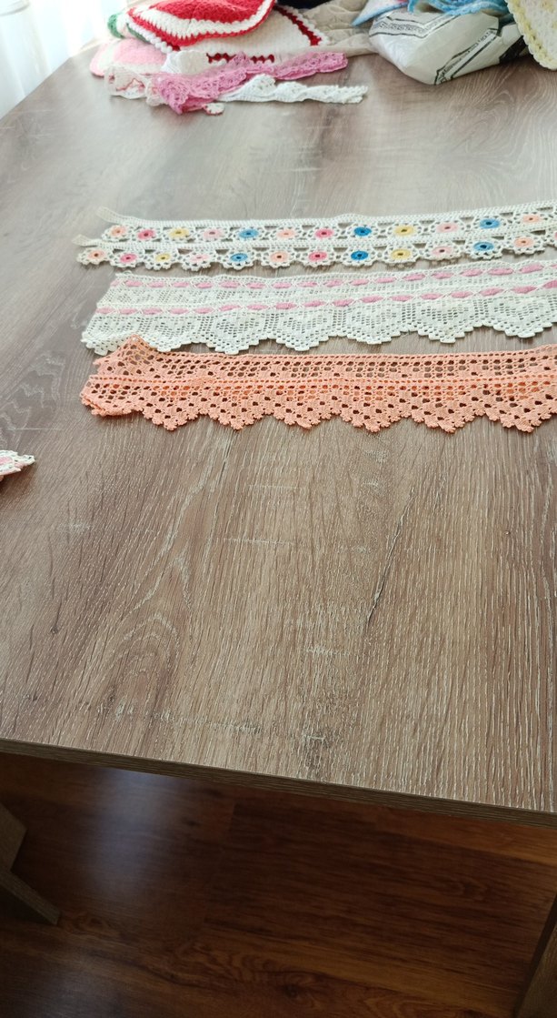 Bohem tarzda beyaz, şeftali ve çok renkli desenlerde tığ işi dantel şeritler. El işi ve dekorasyon için uygundur.