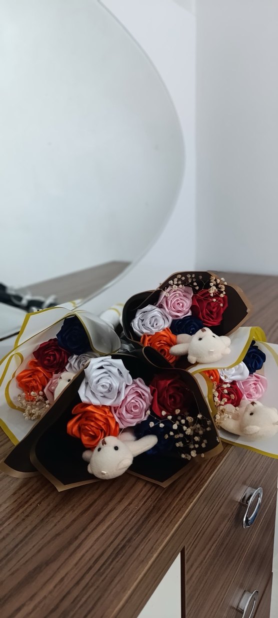 Bohem tarzda renkli yapay güller, küçük peluş ayıcıklar ve narin dolgu çiçekleri ile süslenmiş buketler. Dekoratif kullanım için uygun.