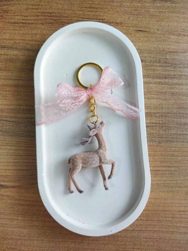 lütfen ilan actiriniz.Bej renkte geyik figürü ve pastel pembe fiyonk detaylı, bohem ve retro Paris tarzı anahtarlık