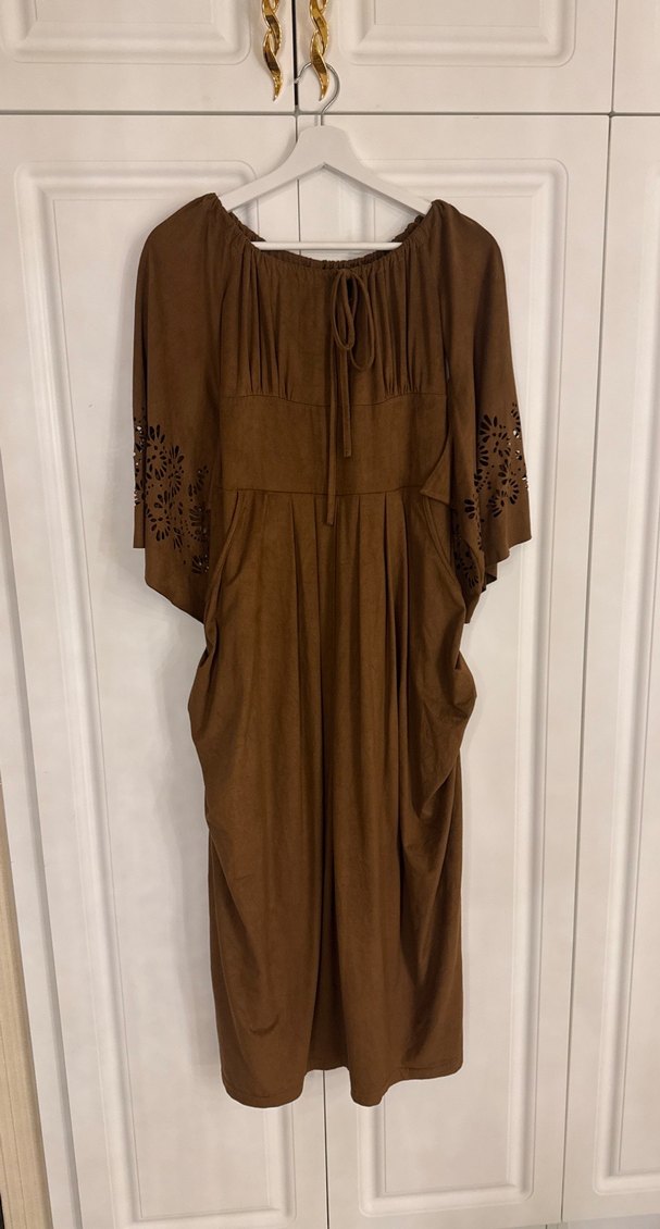Koyu bej renkte süet göğüs dekolteli kısa kollu, drapeli ve kol detaylarında lazer kesim bulunan bohem tarzı üstte çok şık duran bir elbise.