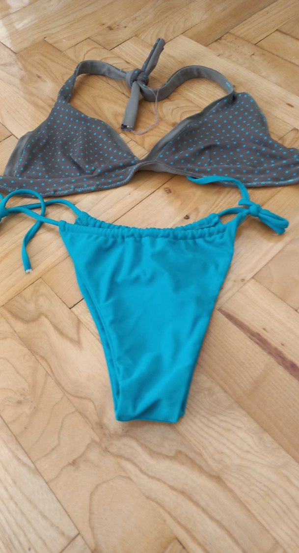 İpli, vücuda oturan üstü turkuaz noktalı gri, altı ise yan bağlamalı turkuaz renkli, bohem tarzda bikini takımı.