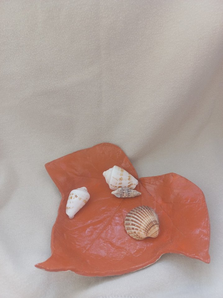 Canlı turuncu renkte, yaprak şeklinde bohem tarzda dekoratif tabak. Küçük eşyalar için uygundur .
