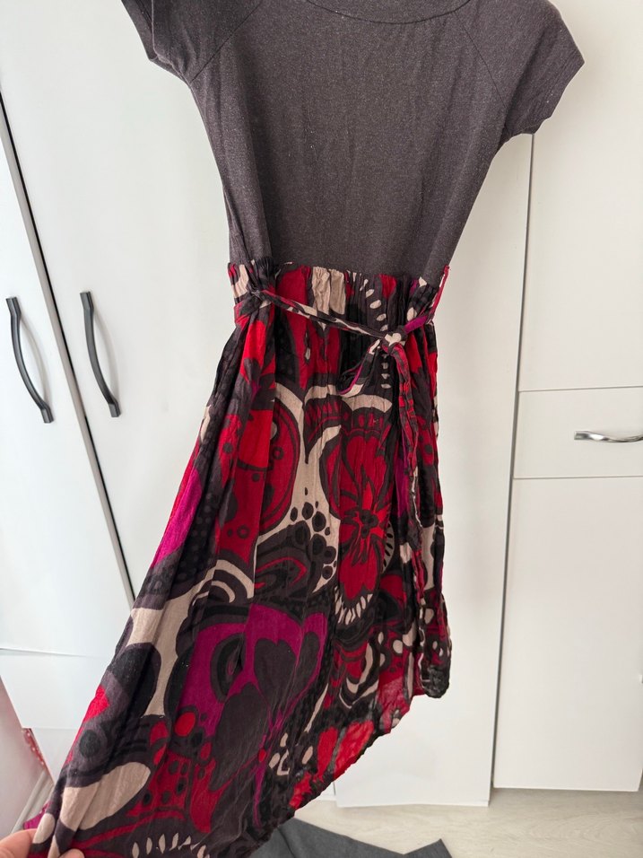 Bohem tarzda, straplez ve kolsuz tasarıma sahip, drapeli desenli etekli, günlük kullanıma uygun dar kesim elbise.