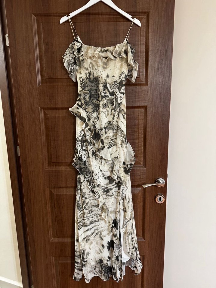 Kolsuz, vücuda oturan uzun elbise, bej ve gri tonlarında batik desenli, drapeli tasarıma sahip, şık bir düğün kıyafeti