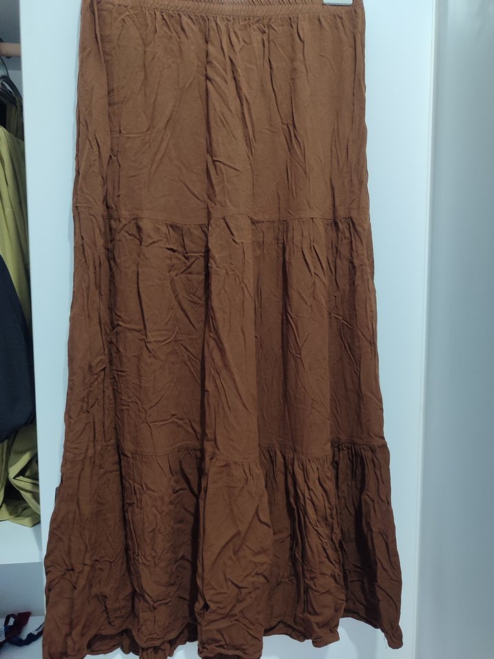 Uzun kahverengi keten etek, bol kesim ve drapeli detaylara sahip. Bohem ve retro tarzını yansıtır, desensiz ve günlük kullanıma uygundur.