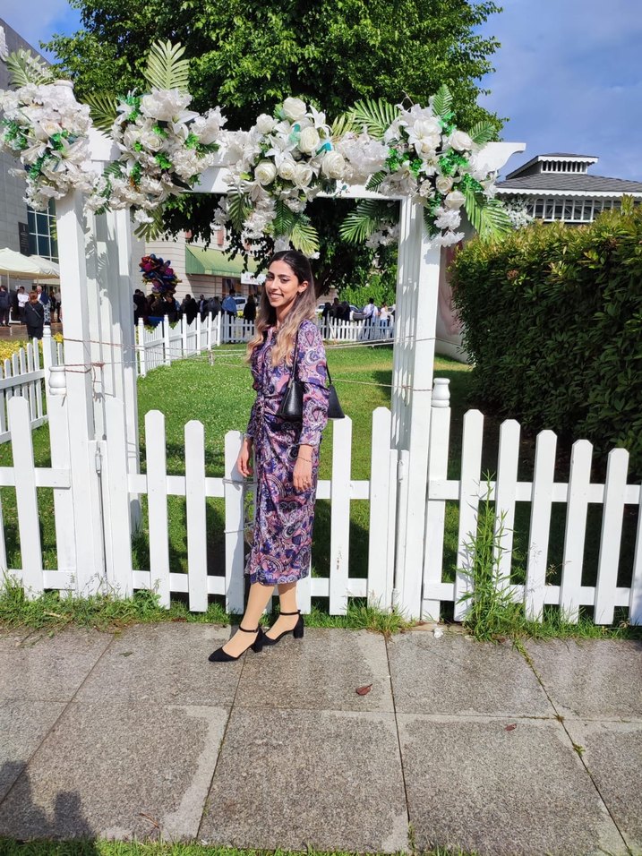 Mor renkte, V yakalı ve ince askılı, bağlamalı uzun elbise. Pastel tonlarda batik desenli ve dantel detaylı bohem tarz elbise.