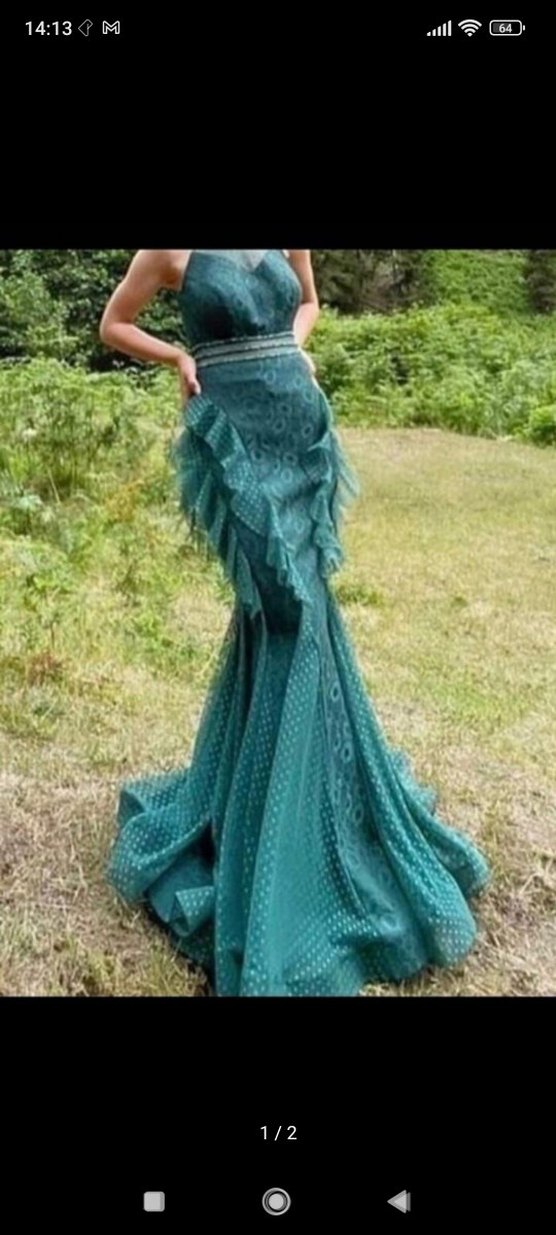 Bohem tarzda, drapeli, straplez ve fit kesim uzun turkuaz yılan desenli kadın elbisesi, şık bir düğün görünümü için uygundur.