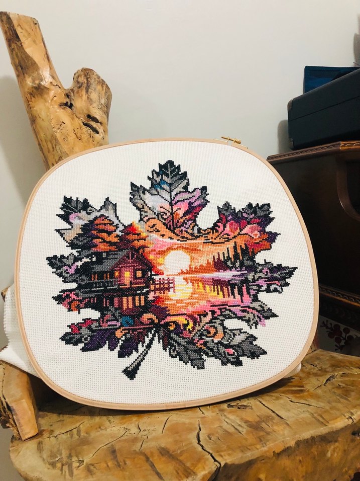 Bohem tarzda, yaprak deseni içinde gün batımı ve kulübe figürlü renkli ipliklerle işlenmiş nakış panosu.