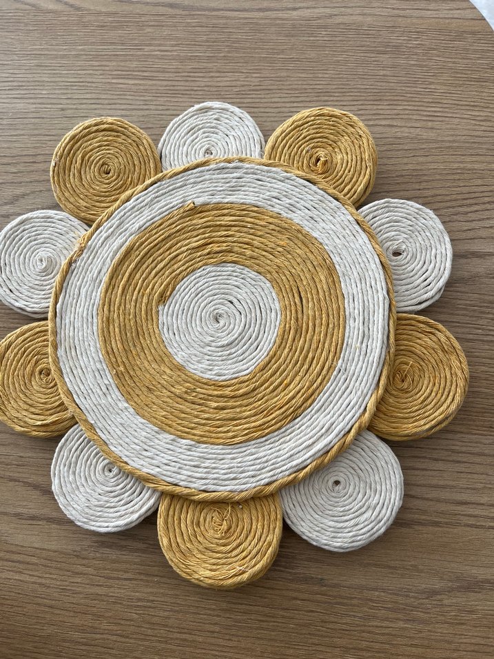 Doğal bej ve hardal renklerinde, bohem tarzda el yapımı yuvarlak hasır supladır. Duvar süsü