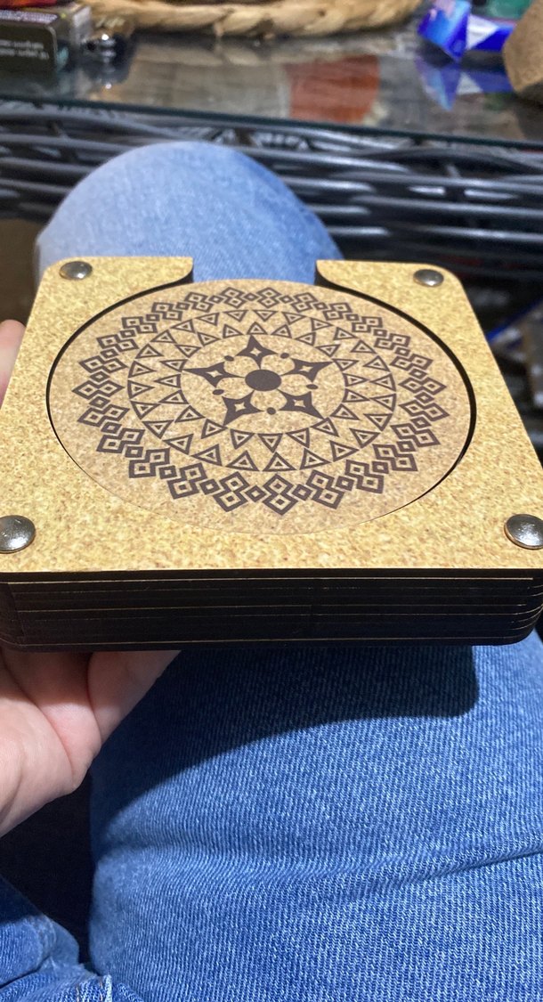 Bohem tarzı mandala desenli ahşap altlık seti. Doğal ahşap görünümü ve metal vidalarla bir arada tutulan tasarım. ☕️