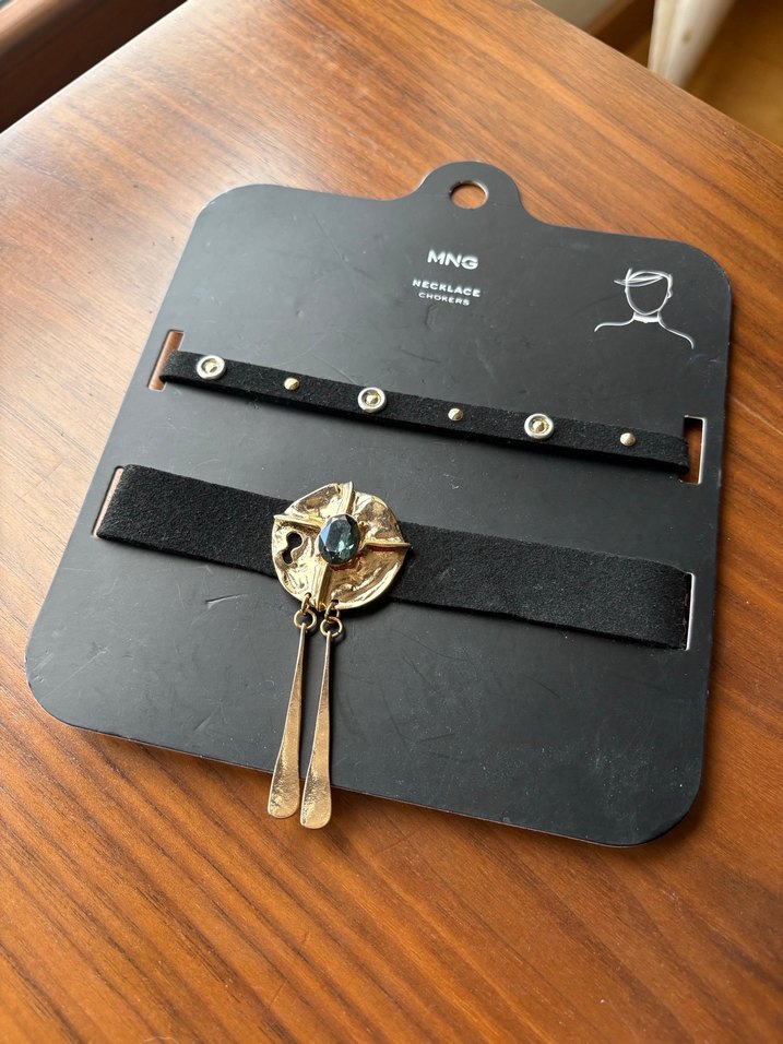 Bohem tarzda, tokalı, altın renkli detaylı, siyah bantlı midi uzunlukta kolye seti. Romantik akşamlar için uygun, vintage ve retro tarzlara uyumlu.
