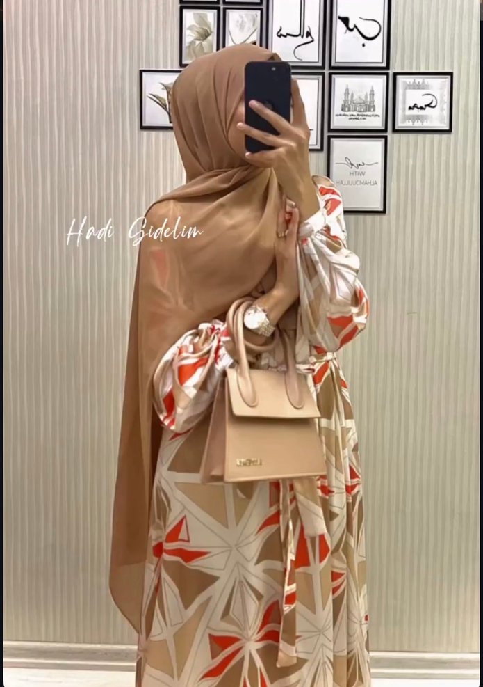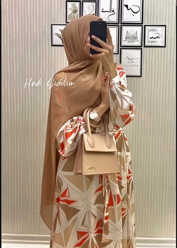 Yumuşak sentetik kumaştan, bağcıklı ve dökümlü tasarıma sahip, açık camel bağlama desenli uzun ve bol kesim elbise. Günlük kullanıma uygun.