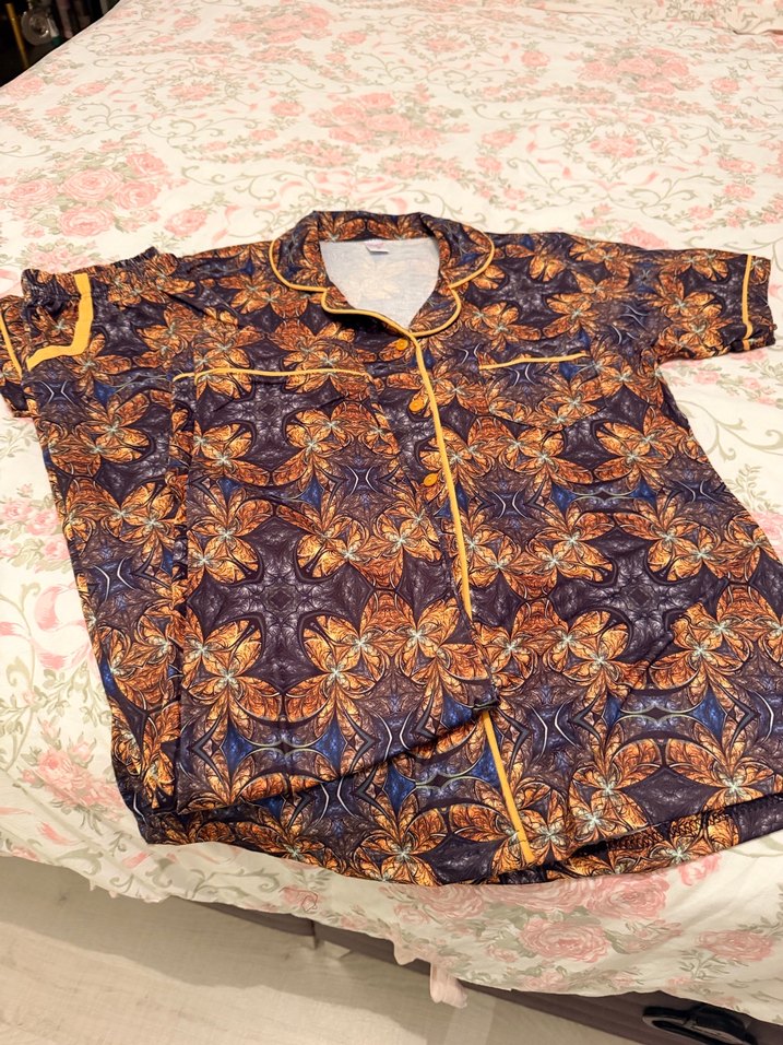 Koyu kahverengi bağlama desenli, bohem tarzı kadın pijama takımıdır. Kısa kollu, bol kesim ve uzun boyludur, rahat kullanım sağlar. Marka temsilidir ürün sıfır bir defa bile giyilmedi
