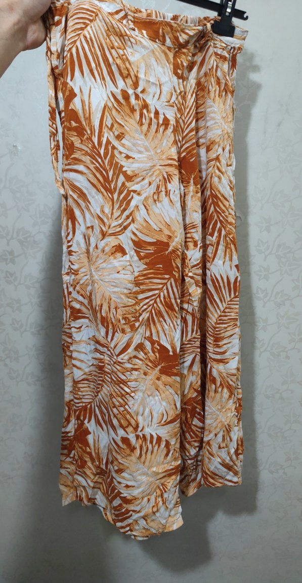 İnce önü bağlamalı, arkası lastikli şık pantolon. Uzun, bol kesim pantolonlar, bağlamalı ve bağlama desenli. Hafif kahverengi tonlarında yumuşak sentetik kumaştan, bohem tarzını yansıtıyor.