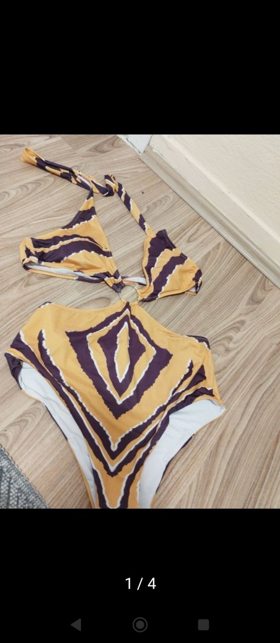 Bağlamalı uzun kesim, camel ve koyu renk tie-dye desenli, askılı ve drapeli tasarıma sahip bohem tarzı mayo, plaj için uygun.