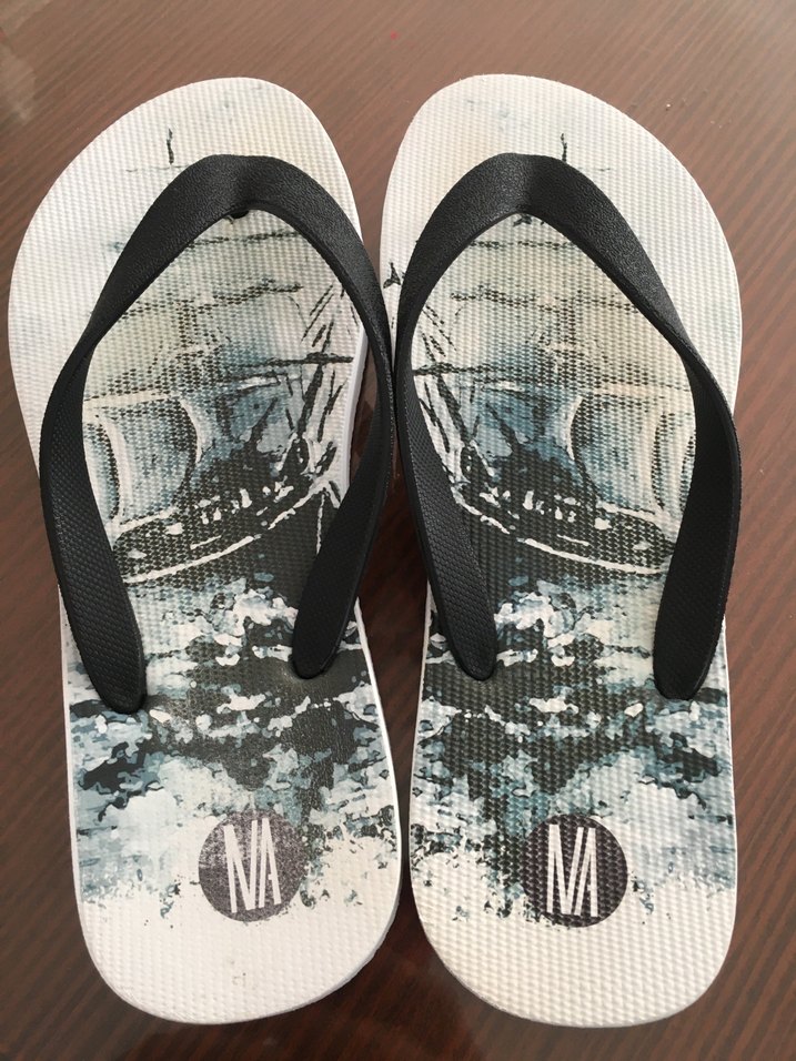 Beyaz kauçuk taban üzerine baskılı vintage desenli, siyah bantlı ve tokalı bohem tarzı erkek terlik.
