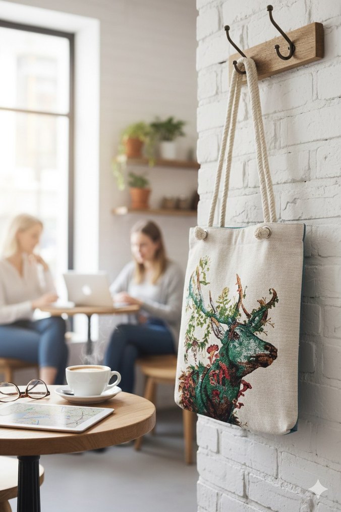 Açık camel renkli, baskılı geyik desenli, püskül detaylı, sentetik kumaştan kadın omuz çantası. İp saplara sahip.Dokuma özel yapım çantadır.