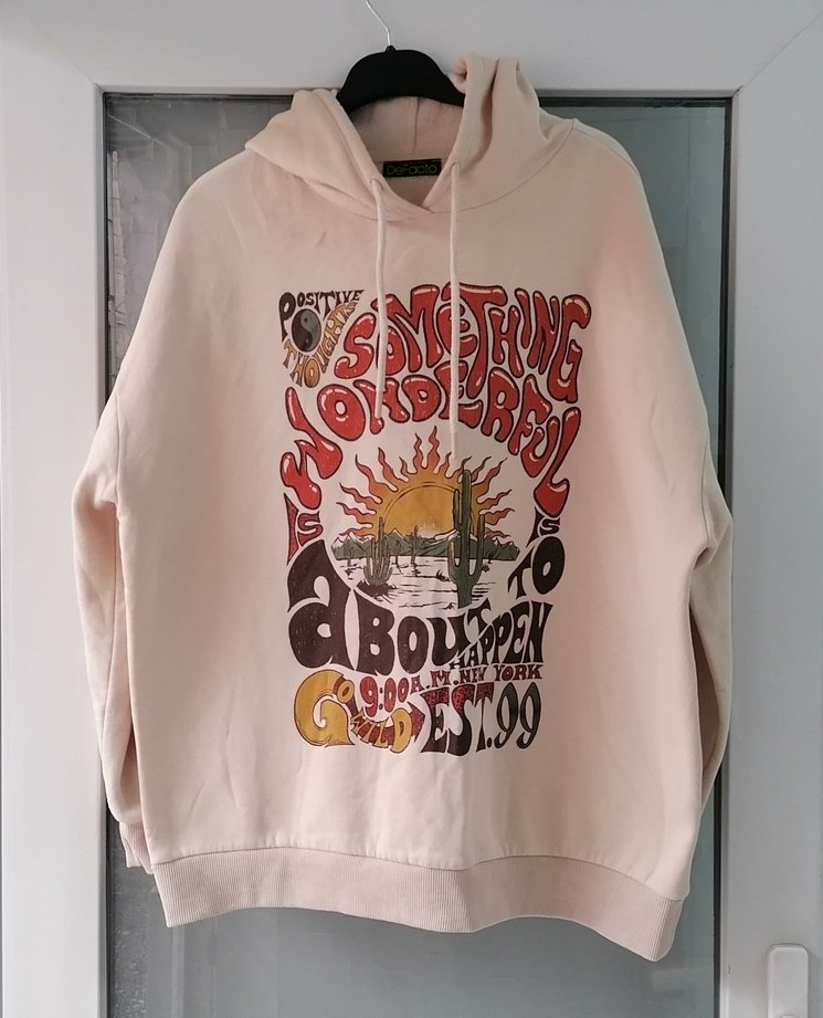 Camel renginde, bol kesim, uzun kollu ve bisiklet yaka kadın sweatshirt. Yumuşak kumaş, bohem tarzı retro baskı ve düğme detayları içerir.